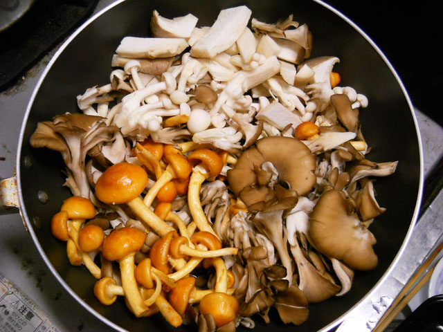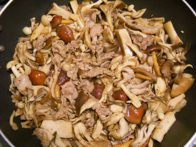 昨日ごちそうになった知人からいただいた、たくさんのキノコ類を炒めものにしました。マイタケ、白ブナシメジ、エリンギ、ナメタケと豚こま肉をかつおだしとしょう油で煮込みました。・°・。味よく染みこむ明日の試食が楽しみです♪