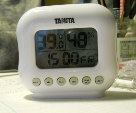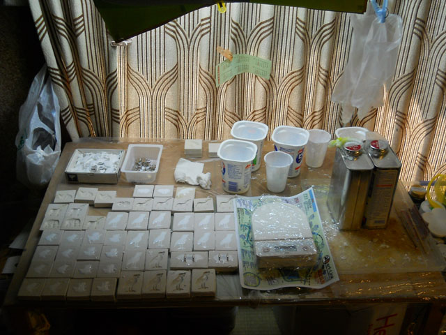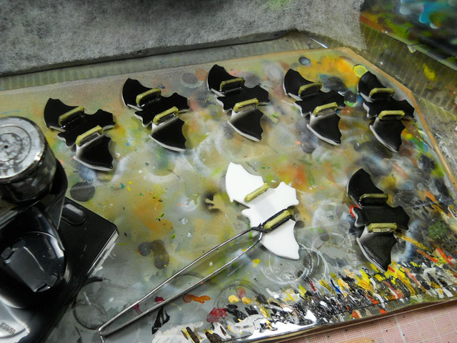 とうとうアトリエの温度計が39℃を記録しました*お風呂なら長湯に適した、いい湯加減といった塩梅でしょうか・・・* 湿度は低めな割りに、不快指数はかなり高目でございました<<本日はそんな高温の下で過酷なポリウレタン樹脂注型を敢行いたしました。通常は20℃前後が平均的硬化時間に設定されておりますが、あまりに温度が高いので急いで作業を進めなければならず、高温で朦朧としている暇も無いくらいなかなかにハードでありました。型抜き後はバリ取り~ヤスリ掛けを行って、塗装に入りました。裏面はブラックで塗装しているので、まさに闇夜のコウモリの様相です☆