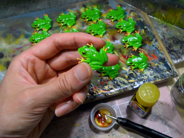 お気に入りのチェダーチーズ風スライスチーズを、最近またセールで安くゲットできたので、ざっくり刻んだゆで卵と一緒にサンドしていただいております♪ レーズン入り フランスパン風・食パンともよくマッチしておいしいです◎ 近所の坂道で枝垂れている、コムラサキの小さな粒つぶが今年もきれいな紫色に染まりだしました。・°・。*青い空とのコントラストもステキです。・°・。● オキナワアオガエル・ブローチ作品ですが、今回はロット数を多めに設定したため、完成までになかなか時間がかかっておりましたが、ようやく巣立ち?が見えて参りました。・°・。塗装の仕上げはチークのような鼓膜の色を載せて完成です。・°・。(o^-^o)*