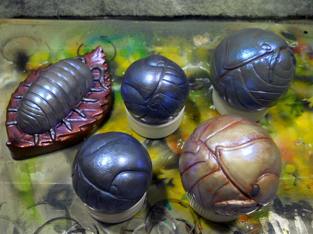 最近導入したパール調塗料で、ダンゴムシの立体作品たちも装ってみました。・°・。印象がだいぶ変わって、リアルテイスト版とはまた違った妖しげな魅力を感じております。・°・。☆ 快晴に恵まれた本日、来年の「第七回・むし展」の 初会合を開きました。次回参加予定のみなさんと、ご来展される方々に「むし展」をより楽しんでいただけるための活性化策について話し合いを行いました。・°・。* ニヒル牛2では「ななこのロジウラ実験箱・七子書館」におじゃまして、温かいほうじ茶をいただきながらナナコさんの書棚展示を拝見いたしました。・°・。ひと様の本棚を覗くというのは中々に興味深いものだなと感じたのでした。・°・。お土産に手製の落ち葉しおりをいただきました。・°・。 ニセ蟹フレークを半値引きでゲットしたのですが、色も形もよく出来ていて感心いたしました。・°・。こちらは“ ズワイガニを5%配合 ”とのことで、お味の方もなかなかにおいしゅうございました。・°・。◎