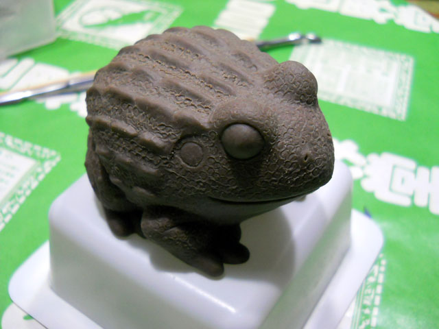 毎朝の水やりタイムで最初に目が合うのは、数が殖えてにぎやかになったオンブバッタさんたちです。・°・。しかしいくら生長力のたくましい西洋朝顔といえども、あまり大勢で大切な葉っぱを食べ尽くされても困るよなぁ・・・と対処に悩み始めているところでしたが。。今朝見かけた大きめのバッタ氏は、昨日咲いてすでに萎んだ花を抱え込んで、おいしそうに召し上がっている姿でした。。それを見て、無用な退治をしなくて済みそうなので少し安堵いたしました。・°・。♪ 猫代番は今朝でお勤めあげです。昨日は食欲は落ちておりましたが、昨晩は雨のお陰で気温も下がったせいか、今朝はみんな元気でご飯もよく食べておりました。・°・。◎ 晩までかかってようやくアフリカウシガエルの原型が完成に至りました。・°・。ボディのふっくら感を出すのに苦心いたしましたが、なんとかでっぷりとしたふてぶてしい感じ?!が出せた気がいたします。・°・。(笑)