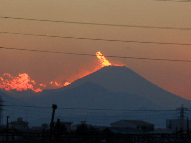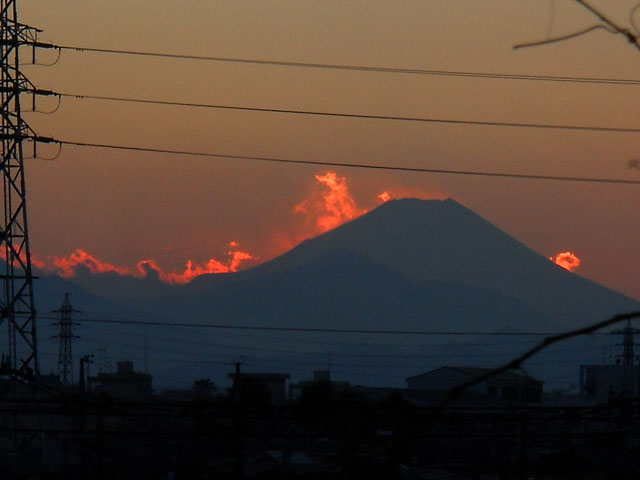 ところで・・・西の方角は山々に沈む夕陽を眺めることが出来ます。・°・。今日は一日快晴に近い好天でしたので、もしや富士山もきれいに見えるかな・・?と期待を抱いてビューポイントまでママチャリを飛ばしました。・°・。そして新年早々そこで思いがけぬ光景を目の辺りにしてしまいました・・・山頂付近から煮えたぎるマグマが火柱を上げながら山腹を流れ下っているところでした。。。興奮冷めやらぬまま自宅に戻り、ラヂヲをつけたのですが・・・今宵のニュースでも全く取り上げられておりませんでした。。果ては気の早い初夢だったのでしょうか・・・? だとしたら「一富士二鷹三茄子・・・」ということで。。めでたしめでたしですね。・°・。(≧▽≦)!