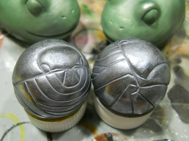 夏前から制作に掛かっていたのに、度々の中断によりなかなか完成にたどり着けずに居りました、オカダンゴムシSサイズとケロぶんちんでしたが、晩秋に来てようやく塗装に入りました。。今回使用した塗料は、乾燥後に乾拭きで磨きますとまるで金属素材のような輝きが現れるというモノです。・°・。☆ 初回生産分のデヴューは、中野ブロードウェイ3階にある「おもちゃのポニー」です♪(詳細はアトリエ☆イボヤギHPのリンク欄→http://iboyagi.zouri.jp/link.htmlをご参照ください)。