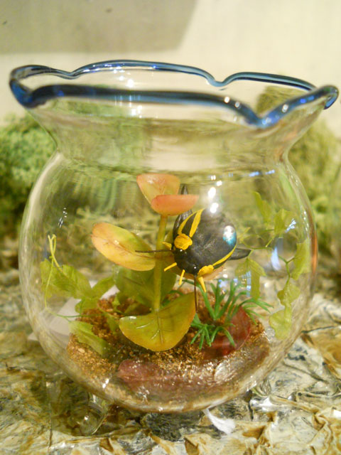 真夏の新鮮なトマトが旬で安いのでうれしいです◎チーズやツナともよく合いますネ! 午後に洗濯物を取り込んで間もなく、激しい雷雨になりましたが、おかげで猛暑が緩和されて、しばらくは過ごしやすくなりました。 歩道の脇の植え込みでアカスジキンカメムシの幼虫を見つけました。成虫は緑金色に赤いラインが大変に美しい、まさに生ける宝石ですが、そのヤングな姿もなかなか渋い輝きを放ちながら、かわいらしくてステキでした◎ 右端は「むし展4」第二会場に出品されている、地球の玉手箱さんのゲンゴロウ作品です。彼女の作風は、ガラスの容器の中に小さなディオラマを演出しているところです。他にもそれぞれの昆虫たちの生息地を再現した、魅力あふれる小世界が展開されておりますので、ぜひ実物をご覧にお越しください♪