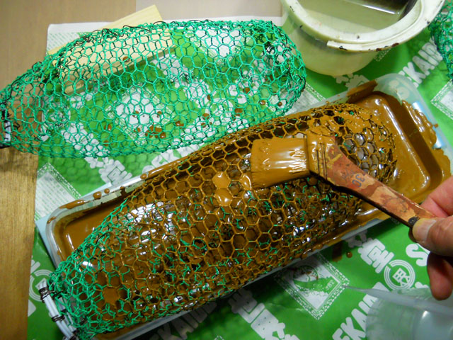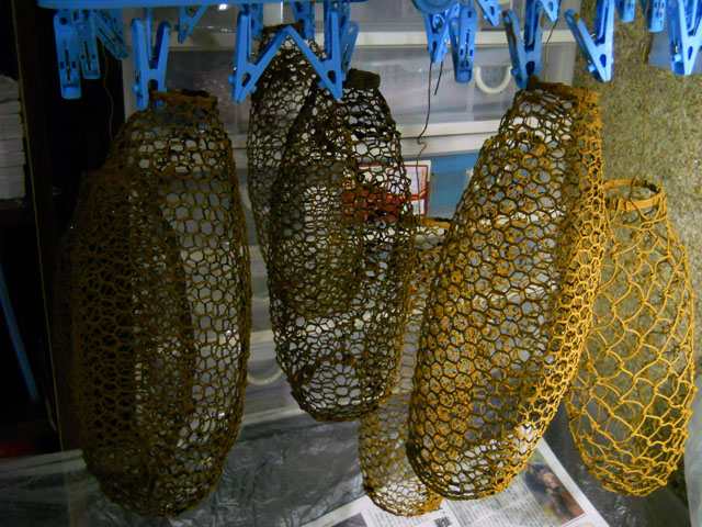 「むし展」の搬入に先駆けて本日も荷物を運び込みました。・°・。ただ今開催中の海中アパルトメントでは、また新たに追加納品された作品もあったり、床には涼し気なクラゲのシルエットがステキに描かれて(貼られて)おりました。・°・。* 帰宅後、スカシダワラの塗装を進めました。・°・。乾くと耐水性になる塗料を、たっぷり張ったバットに浸しながら、塗り残しの無いように注意しながら仕上げました。・°・。ランドリーピンチハンガーに吊るして乾燥に入りました。・°・。*