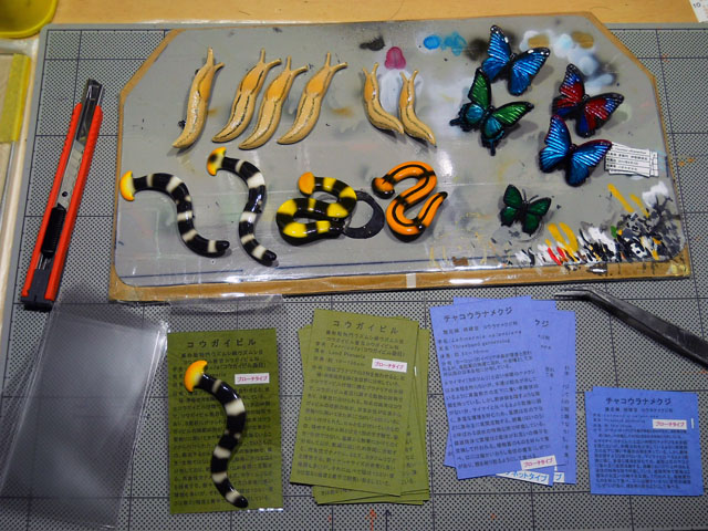 厚切りトーストにトマトとメンチカツのボリュームサンドで、今朝も朝からガッツリ食べて、猛暑に備えて作業に入りました。・°・。明日はいよいよ「むし展」のニヒル牛2会場の搬入日のため、ブローチとマグネットのレリーフ作品の解説カードを作成して、パッケージィングいたしました。・°・。今夏の「むし展」では、参加作家それぞれが「ひとり一標本箱」として、二つの会場に各々1箱ずつ(計=1作家に付き2箱ずつ)、形式などは自由スタイルで、オリジナルの「標本箱作品」を展示するということになっております。・°・。標本ラベルの学名や地名などをよくよく読んでみますと・・・ちょっとしたいたずら心でジョークやユーモアが紛れているかもしれません。。。(^-'*)!?