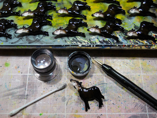 スーパーの青果コーナーで目新しい品種のすももが、半値引きになっておりました。・°・。すもも好きのわたくしとしてはもちろんすかさずゲットいたしました。・°・。山梨産のサマーエンジェルという品種で、名前もすてきですが程よい酸味と心地よい皮の食感がございました◎ 猛暑続きの最中、公園の木陰でコフキコガネが仰向けになっていて、アリが数匹たかっておりました。。まだ脚を動かしていたので、そっと指を差し出すとしっかりとつかまってきたので、近くの水飲み場で指を濡らして水を飲ませてみました。・°・。少し元気になったようで、サツキの根元の土の上に下ろしてあげると、ゆっくりと歩き出しました。・°・。* 「むし展」向けの制作が一段落しましたので、再び定番アイテムの生産に取り掛かりました。・°・。写真はオカピの目入れの工程です。適度な大きさと形になるようにルーペで確認しながら、神経を集中して取り組んでおりますが・・・こう暑いと細かい作業は精神的にも堪えます。・°・。*