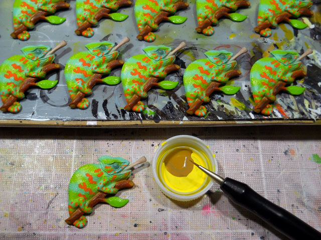 朝起きて水道の蛇口に手を伸ばすと。。水栓の留め金の青い部分が陽を受けてきれいに輝いて見えました。・°・。それはまるで青い系外惑星を思わせる様なステキな深い色合いでした。・°・。早起きのささやかでうれしい発見でございました。・°・。○ ブローチ作品の中で最も塗装工程の多い エボシカメレオンの仕上げが近づきました。・°・。手間暇のかかる分、その完成の喜びも大きいと感じております・・(*´ー`) 毎日の日課となった近所の運動公園の懸垂ですが、連日の鍛錬の成果もあって?!。。手に豆が出来てしまいましたので、イボイボ付きの軍手をはめることにいたしました。おかげで豆の痛みを気にせずにこれまで以上に懸垂活動に専念することができるようになりました( ̄ー ̄)/ この調子なら。。年内目標の連続20回達成は如何に・・・(≧▽≦)!