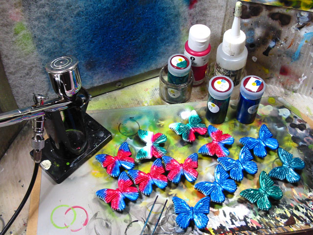 今日撮影した様々な画像を、先ほどPCに取り込む際に、誤って消してしまいました。。寝不足で疲れているときは、注意力が散漫になって危険ですね。。それで気持ちが結構へこんだものの、気を取り直して、アトリエに戻っていくつかスナップ的に撮ってまいりました。しかし消えてしまった画像というものは、余計に記憶が鮮明に甦って来るのが不思議ですね・・・。 左端はアトリエで毎日使うダスターです。木綿の素材の布きんなどが、吸い取りがよく、早く乾くので便利です◎ PETボトルのキャップは、ハンドペイントの際のパレットとして活用しています。個別だと、塗り途中で中断する際など、円柱を重ねたアクセサリーケースに入れて置くと、乾燥しないので重宝します。右端は今手掛けている蝶の帯留めの新色バージョンです。まだ塗りの途上で、下地になるメタリック色を先に塗り終えた状態です。