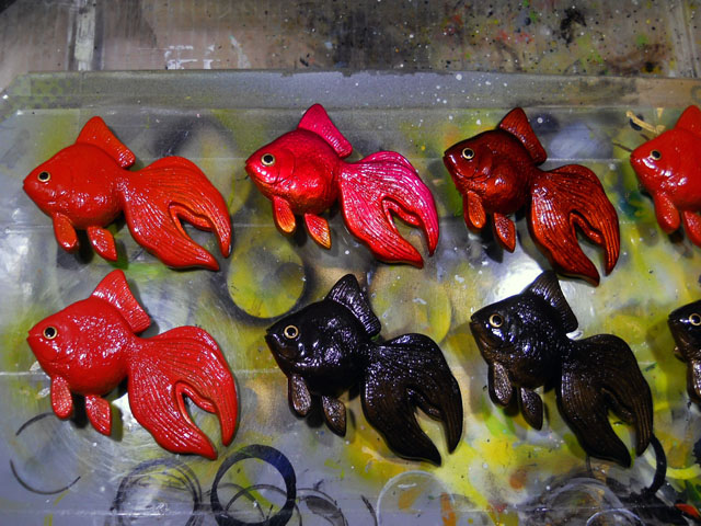 リュウキンたちもすっかり色付いて、いよいよおめかしを施して門出を迎えることができました。・°・。今回は定番カラーの他に、変わり色タイプも加えて6パターンのリリースとなります。・°・。* 春先から約二ヶ月間作品展示をさせて頂いておりました、杉並区の井荻小学校さんへ搬出作業に参りました。・°・。ご担当の先生によりますと、展示ケースの前にはいつも生徒さんの姿が絶えませんでした。。とのうれしいご感想もいただけて、この度の素晴らしい機会を与えていただけたことを改めて感謝いたしました。・°・。(^-^ゞ 豆千代モダンさんへのリュウキン帯留めの納品も無事に済ませた帰り道、十六夜の月がほんのりと黄色みがかったやさしげな光を放っておりました。・°・。◯