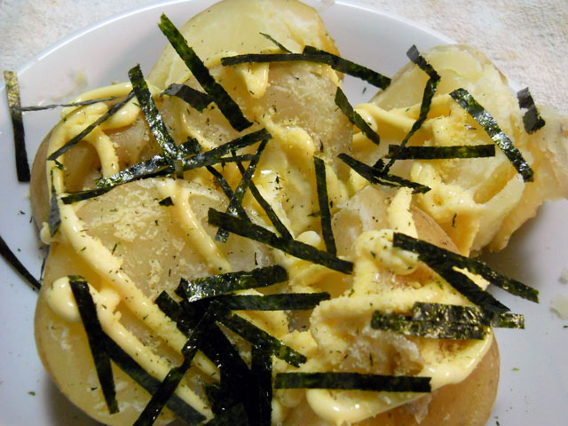 台所の流しの上の窓辺に置いていたヒヤシンスの水耕栽培ですが、どうも日当たりが足りず生長に影響がありそうな気がいたしましたので、階段の踊り場の南向きの窓辺に移しました。ここなら日中陽の当たる時間はかなり暖かくなるので、よりよさそうです◎ 球根の先端と、球根の脇の方からも緑色の小さな芽が出ているのが確認できました。。◎ じゃがいもの皮をゴシゴシとよ~く洗ってからゆでました。・°・。そして四等分にカットした上にチーズとマーガリン、マヨネーズ、焼き海苔をのせて、ホックホクのをいただきました。・°・。♪