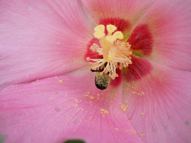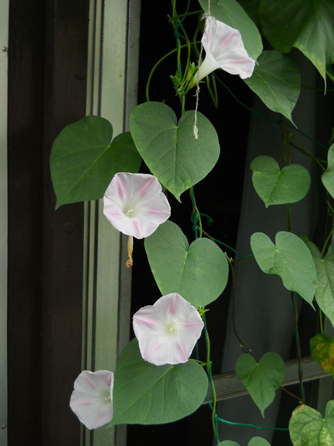 アサガオたちが日増しに花の数を増やしていて楽しみです。・°・。♪ 引き戸の端では極淡いピンク系の花が数珠つなぎで咲いておりました。・°・。* 芙蓉の花の中で小さなハチが盛んに動きまわって、お尻の毛のふさふさに黄色い花粉をいっぱいに付けて、とても幸せそうに見えました。・°・。◎ 昨日でひとまず「むし展」の両会場への搬入と展示装飾を終えて、本日はアトリエの片付けを行いました。。ここでしばらく一休みしたいところですが・・・まだまだ制作課題が詰まっておりますゆえ、晩酌は極低アルコールのビールテイスト飲料で乾いた喉と身体を癒しました。・°・。*