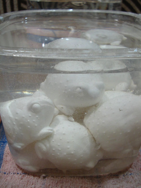 アカトマトガエルとフクラガエルの制作に入りました。型抜きからしばらく時間が経っておりましたので、バリトリを行う為に水に浸して少しやわらかくしてから作業に取り掛かります。水に浸している間、カエルたちは時折小さな気泡を出す際の「キュー・・・・」というかすかな音を立ておりました。。。今夜は予報どおり木枯らし一号も吹いたようで、寒さも急に増して来ましたので、またスタミナをつけるために冷凍庫から解凍しておいた豚もも薄切り肉を使って、生姜焼きをこさえました。今回はタマネギを添えていただきました。しょうが汁に浸した肉を再度焼く瞬間の「ジュッ」という音がたまりません・・・さぁこれからまたがんばるぞぉ...と、気合が入ります◎