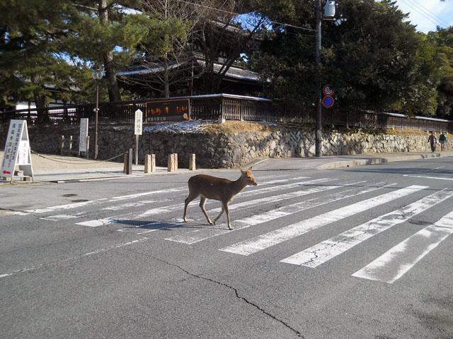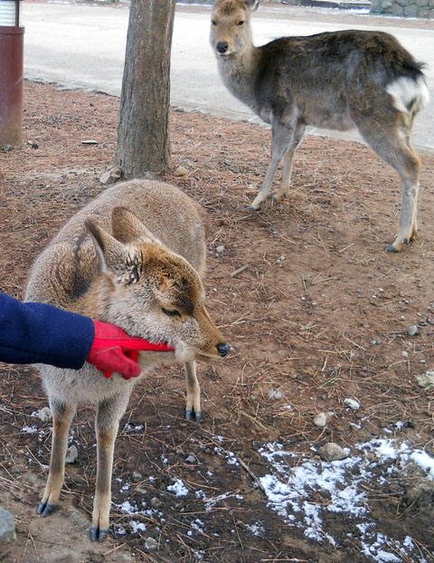 昨夜は今月最後の納品を郵便局から発送して、旅支度をあわてて整え出掛けました。・°・。夜行バスの行き先は奈良です* 深夜に休憩で停車した土山サービスエリアでは、雪が舞っていてうっすらと積もっておりました。。フードをかぶって暖房の効いた建物に駆け込みました。・°・。自宅で急いでこさえた鮭のおにぎりとみかんと緑茶で気力を取り戻して、再び忍耐の要する座席へと戻りました。・°・。* 奈良駅には定刻よりも少し早目に到着して、駅前のカフェで落ち着いてから奈良公園へ歩き出しました。 今回の旅の目的のひとつ「鹿の観察」の結果解ったことは・・1.鹿はシカ煎餅が好きである。2.奈良公園の鹿はきちんと横断歩道を渡る・・ということです。・°・。*