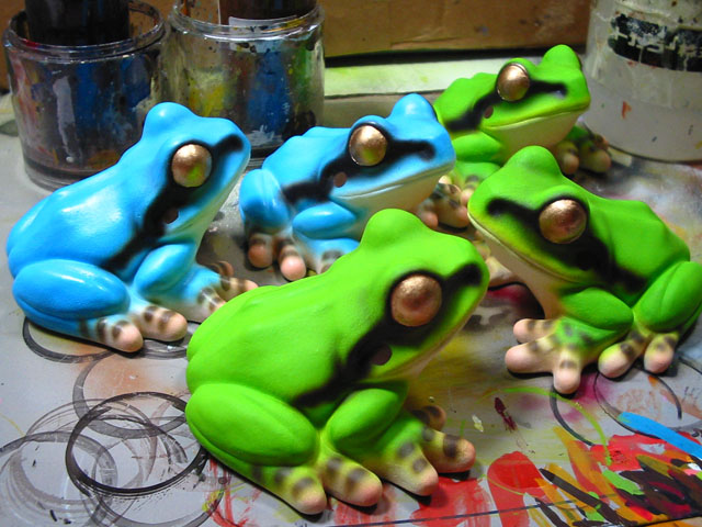 昨夏に芽を出したアボカドの苗は二本ありましたが、一本は寒さにやられてしまいました。。しかしもう一本は地上部は茎も半分枯死してしまったものの、春になって実は半分より下の部分はまだ生きていることが分かり、少しずつ芽が育って回復していくのを見るのが楽しみでした。そしてとうとう写真のようにすっかり生き返ったのです♪ ニホンアマガエルの塗装もだいぶ進んで参りました。 今回はノーマルな黄緑色と、黄色色素欠乏タイプの二種類にしましたが、今後はいろいろなカラーバリエーションを施そうと考えています。 先日半値でゲットした豚のロース肉を使って、しょうが焼きをこさえました。小麦粉をまぶした肉を熱した油に入れたときのジュージュー言う、おいしそうな音がたまりませんでした。。