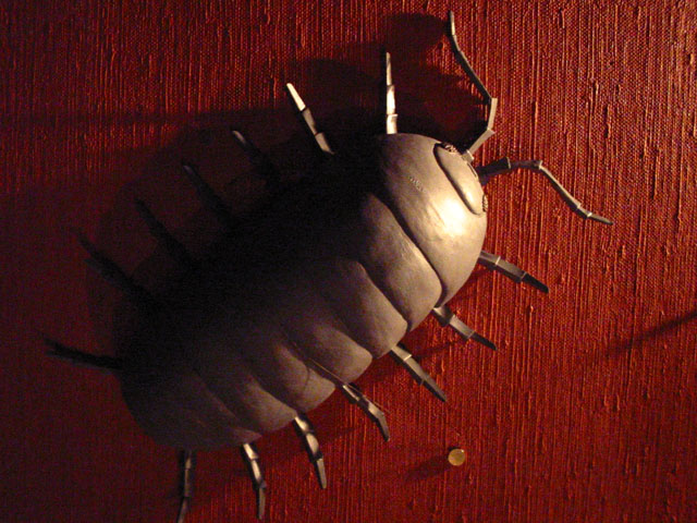 今日は猛暑復活で二階のアトリエ作業はなかなか身に堪えました...普段の水分補給は真水を摂っていて、塩分は食事の際に普段よりは少し余分に摂るようにしているので、大丈夫...と思っていたのですが、今夜遅くなって頭痛と嘔吐感が激しくなってきて、横になって休んでも治まりませんでした。そこで粉末のスポーツドリンク剤を溶かして、電解質溶液を作って補給したところ、効果てき面に頭痛も吐き気も治まりました◎ 今後は大量の発汗時には、きちんと経口補水液で対応したいと思ひました。 夕方に西荻窪で友人と待ち合わせて、中野で買ってきたという今川焼きをいただきました。チーズ、ソーセージ、焼き芋、つぶあんを半分ずつ食べましたが、味の取り合わせがナイスで楽しめました◎ THE"ロック"食堂で巨大ダンゴムシの展示をさせていただくことになり、今夜設置に参りました。全部で6匹の巨大ダンゴムシが、薄闇の中スポットライトに浮かび上がる不気味な姿を、ご来店の節にぜひ見つけてください♪