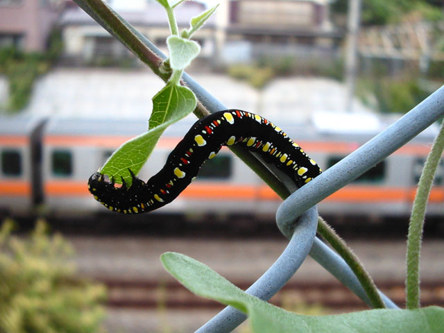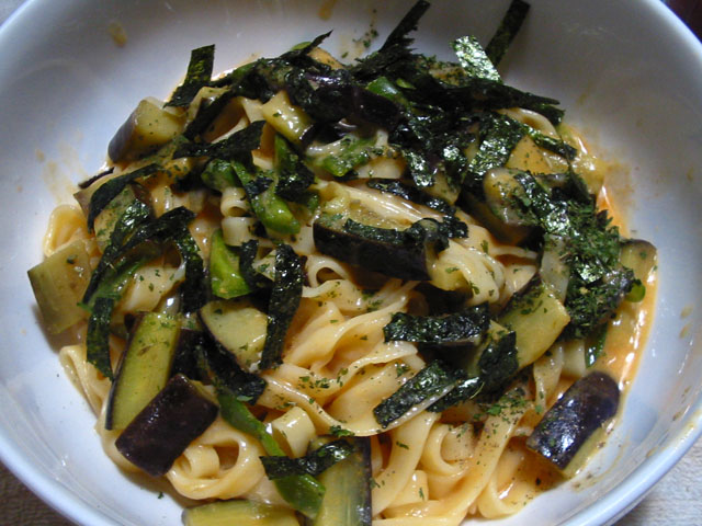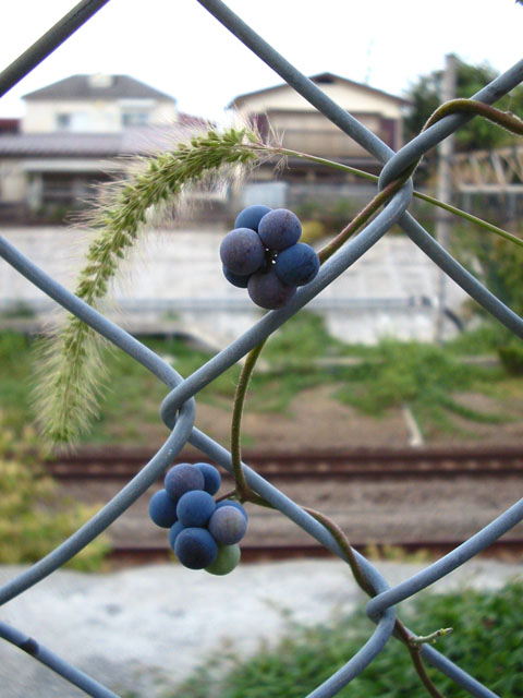 いつも利用している駅に向う線路沿いのフェンスできれいな紫色の実を見つけました。連想で気がついたのは、そう言えばまだ今年はブドウを食しておりませんでした。最近はたくさんの品種が出回っているので、今秋もいろいろ試してみたいです◎その脇には派手な柄をしたイモムシが無心につる植物の葉を食べておりました。ちょうど中央線が走って来たのですが、イモムシの柄がまるで電車の窓とドアの様なのに気がつきました□■■□■■□ いつもスーパーのチルド品コーナーで、つけ麺ばかり買っていたのですが、たまには違う麺類もと思い、生めんタイプのパスタを買ってみました。どこぞの有名シェフの監修らしく、今回はフェットチーネのクリーミートマトというのを、具はナスとピーマン、それからナチュラルチーズと焼き海苔を添えていただきました。