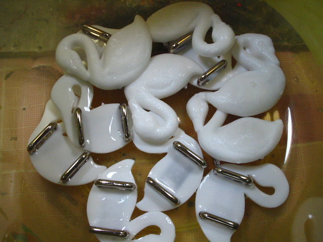豆千代モダン様にて 2011年1月14日(金)~2月14日(なくなり次第終了)に開催される 「みんなのリボン展」向けの白鳥の帯留め作品を制作しています。写真はバリ取り・ヤスリ掛け後に洗浄して乾燥させているところです。関連サイト→http://highcalory.jugem.cc/?eid=74