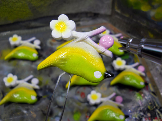 昨夜遅くに雪は雨に変わったようで、だいぶかさが減っておりましたが、朝になると明るい陽射しが照りはじめたので、大雪はさらに融けてゆきました。・°・。* アトリエで作業している間も、屋根の雪が次々と落下する音が聞こえておりました。・°・。* 雪解けとともに帯留め作品の梅の小枝にも花が色づき始めました。・°・。* 本日は都知事選の投票日でしたが、 作業が押してしまい投票所へ出掛けるのがすっかり遅くなってしまいました・・・しかしまだ路面にはだいぶ雪が残っておりましたので自転車はやめておきました。・°・。投票の締切時間を気にしながら小走りで急いだのですが。。靴底に穴が空いていたことを思い出して・・・冷たい! 寒い! つめたい! さむい・・と連呼しながらなんとか投票には間に合いました。。(>_<)! 。・°・。大家さんから先日の猫代番のお礼に「チョコ南部」という岩手のお土産菓子をいただきました。・°・。伝統的ないわゆる南部せんべいを細かく砕いてチョコレートで固めたものでしたが、これが意外なおいしさでいたく感激いたしました♪*ちなみに使われている南部せんべいは「チョコ南部」専用に焼いているそうです。・°・。◎