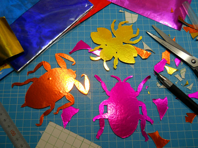 線路沿いの雑木林のフェンスに、まだ青いノブドウの実を見つけました。・°・。● ノブドウの葉には様々な虫達が好んでやってくるので、駅までの往復に観察するのがささやかな楽しみです。・°・。☆今年のニヒル牛2の「むし展」会場には、タイトル文字を参加メンバーで手分けして作成することになりました。・°・。厚紙にカラーホイルを貼って、むしの形に切り抜いて「むし文字パーツ」を作ります。・°・。これらを持ち寄って大きな「むし文字」を形作るという魂胆でございます。・°・。(^-'*) 大家さんから先日の猫代番のお礼に笹かまぼこの詰め合わせをいただきました(o^-^o)。・°・。いろいろな味を少しずつ楽しんで作業の疲れを癒やされております。・°・。♪